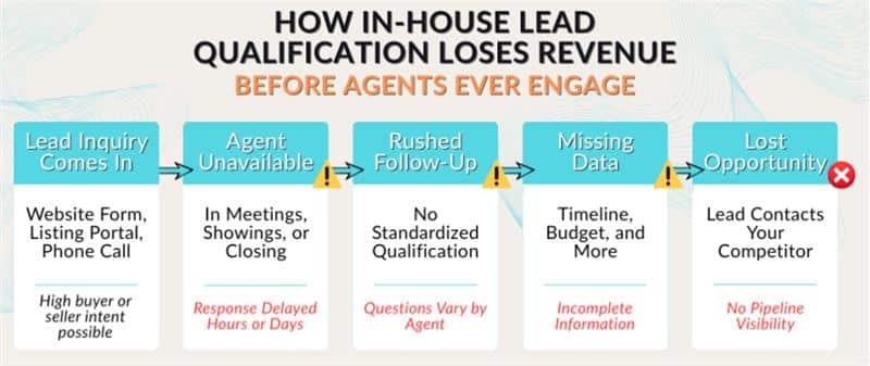 Even the most experienced teams struggle to maintain consistent qualification when the process lives inside the organization. Agents are ultimately incentivized to close deals, not manage early-stage inquiries, so qualification often becomes rushed or deprioritized, especially during busy periods.