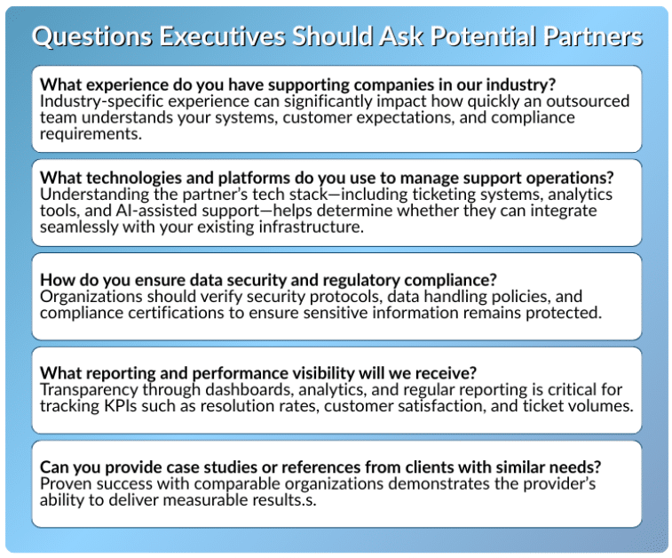 - Financial and operational indicators: Review total cost of ownership, per-ticket costs, scalability needs, and potential savings compared to maintaining an internal team.